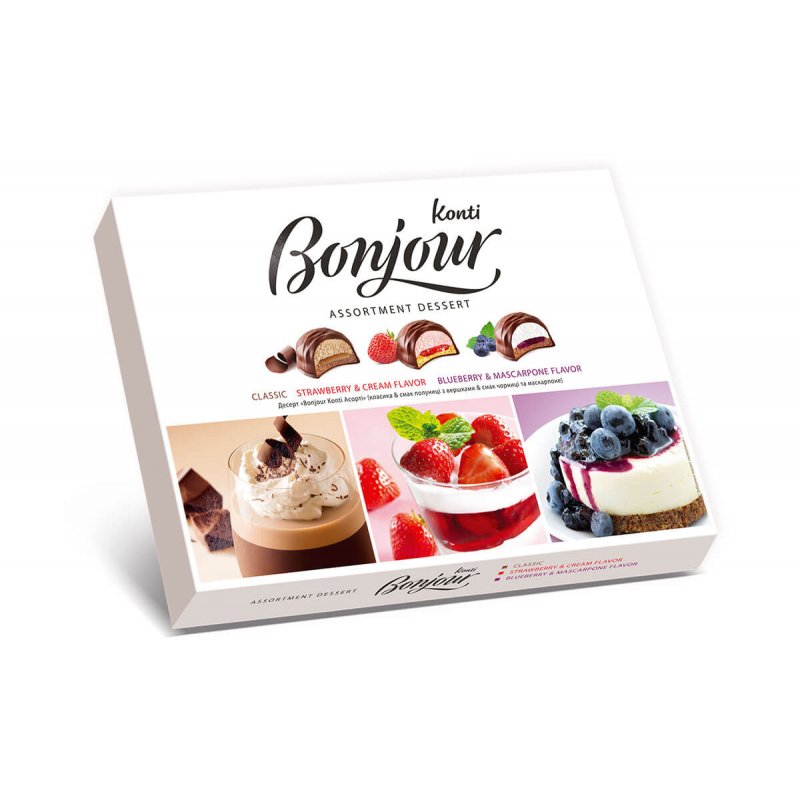 Ingredienti: Zucchero, sciroppo di amido di MAIS, farina di FRUMENTO pregiata, sostituto del BURRO di cacao di tipo laurico non temperato (olio di palma idrogenato, emulsionanti E 492, E 322), cacao magro (contiene il 10-12% di burro di cacao), olio di palma raffinato deodorizzato, umettante sorbitolo, sostituto del grasso del latte (olio di palma e sue frazioni, emulsionanti: E 471, E 322; antiossidanti: E 304, E 306), siero di LATTE in polvere, gelificante pectina, regolatori di acidità acido citrico, citrato di sodio, ALBUME d'UOVO, cognac, massa di cacao (0,2%), aromi, emulsionanti: lecitina di SOIA, E 476, E 471, sale alimentare, emulsionante: "Quick 96" (acqua potabile, zucchero, emulsionanti E 471, E 475; antischiuma E 570, stabilizzante di umidità E 1520, E 476), lievito in polvere, regolatore di acidità bicarbonato di sodio, coloranti: E 150d (colorante E 150d, conservante anidride solforosa), estratto di viola (estratto di carota nera, regolatore di acidità acido citrico, conservante E 202), estratto di patata dolce viola (E163, maltodestrina), succo concentrato di carota nera (carota nera, acido citrico), lievito in polvere carbonato di ammonio, conservante sorbato di potassio, polvere di mirtillo liofilizzata (0,002%), polvere di fragola (0,002%), aroma naturale di estratto di vaniglia. Può contenere tracce di FRUTTA a GUSCIO e ARACHIDI.