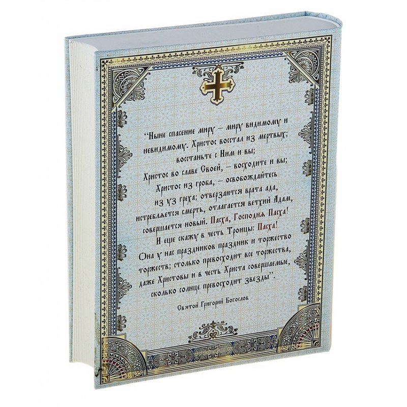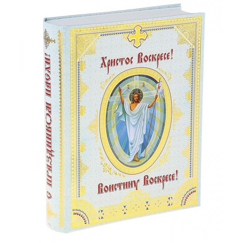 Книга-шкатулка "Христос Воскресе!" гжель 22 Х 16.5Х 4.5 см - изготовлена из качественного пластика обклеенного плотной бумагой с полноцветным изображением и с золотистым тиснением орнамента. Эту книгу стоит поддержать в руках, чтобы всецело оценить ее качество и великолепный вид.Она будет достойным подарком к празднику Пасхи и порадует Ваших близких.