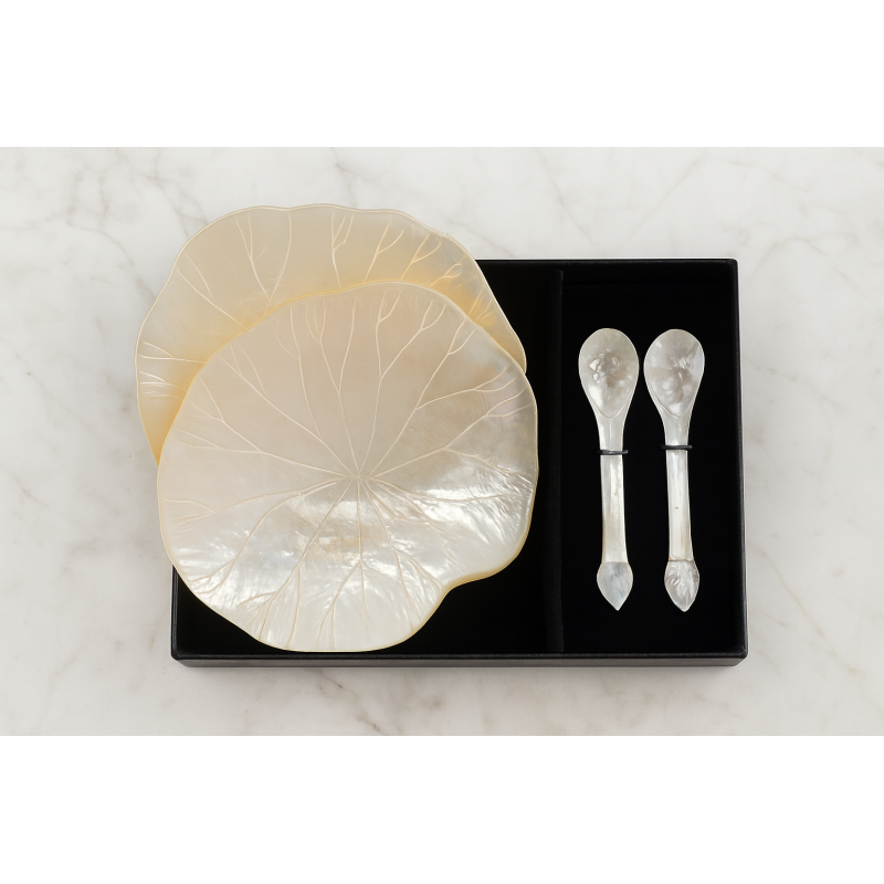 Un tocco di lusso per la tua tavola: 2 piattini e 2 cucchiaini in madreperla, pensati per servire caviale senza alterarne il sapore. Un must per chi ama l’eleganza e la qualità.