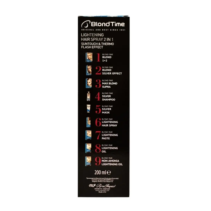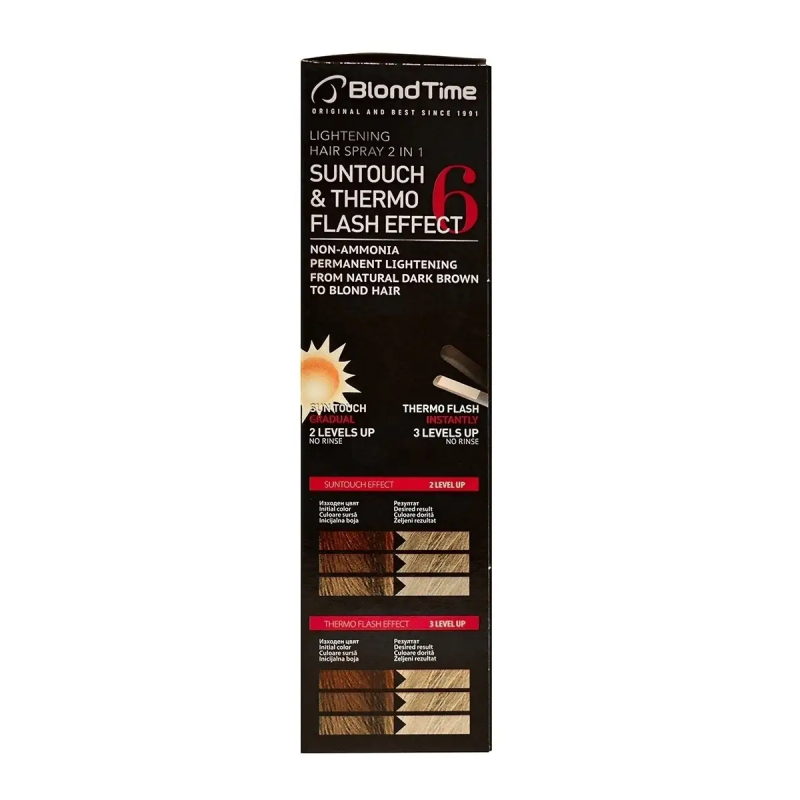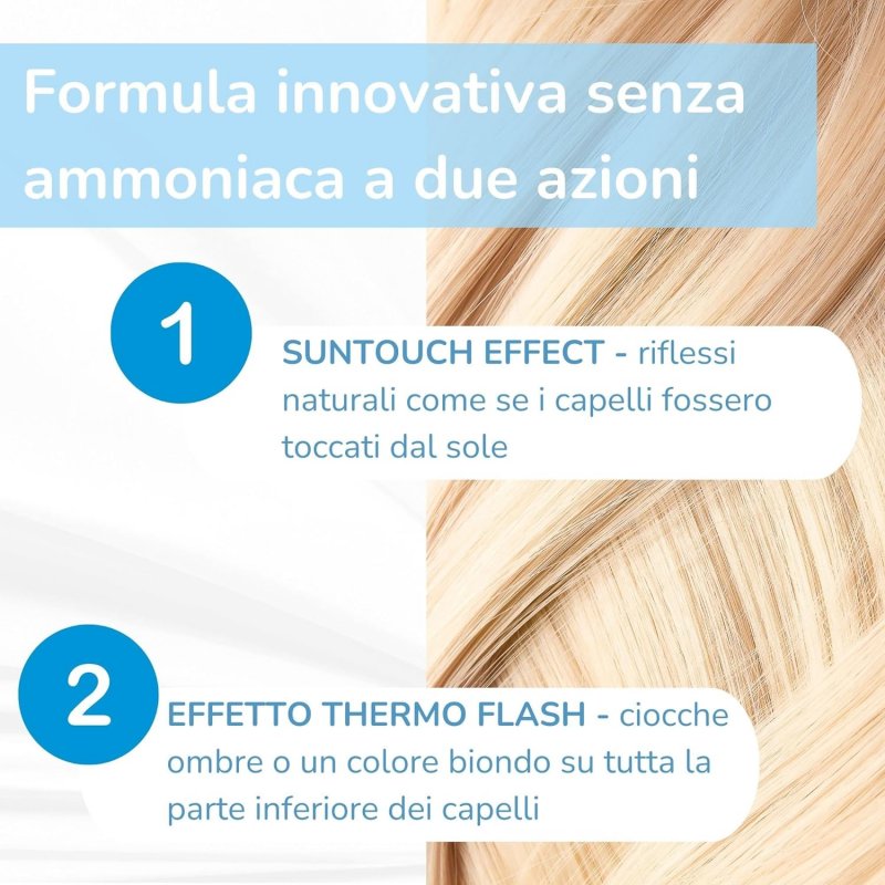 1/ Effetto SUNTOUCH – se vuoi che i tuoi capelli diventino più chiari oppure ottengano l'effetto dei capelli schiariti dal sole, applica lo spray su tutta la lunghezza dei capelli. Non lavarlo via. Se esposti alla luce solare, i tuoi capelli diventeranno gradualmente fino a 2 tonalità più chiari. Chiudi gli occhi mentre applichi il prodotto!