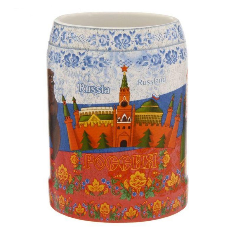 Кружка пивная "Россия", 500 мл, керамика, деколь в оригинальном дизайне сделает посиделки с друзьями ещё душевнее и веселее. Она непременно понравится людям с хорошим чувством юмора. Изделие покрыто ярким авторским рисунком, что делает его по-настоящему уникальным. Удобная форма бокала, чуть суженная у края, оставит игривые пенные пузырьки внутри, сохранив вместе с ними аромат любимого напитка.